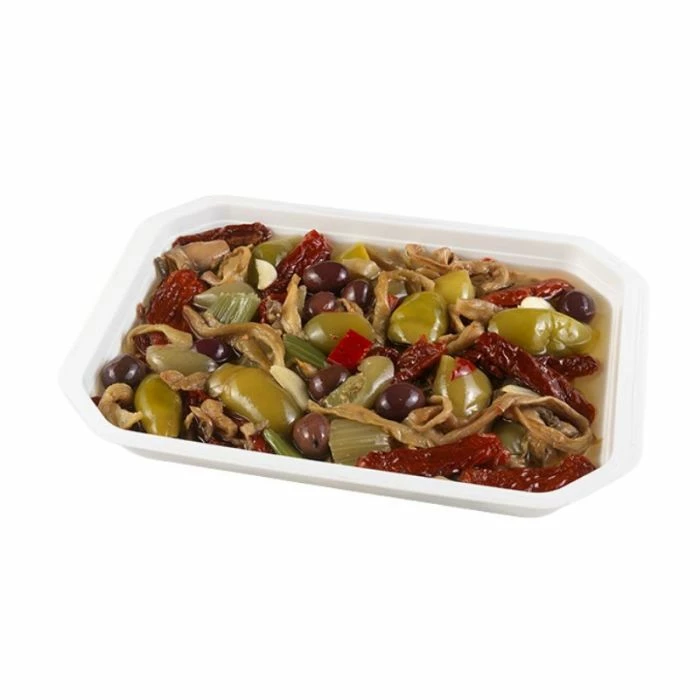 | ingredienti | Ortaggi misti in proporzioni variabili 65% (NON UE) (Pomodori secchi, carciofi melanzane a filetti, SEDANO, peperoni arrostiti funghi di muschio: volvaria volvacea, olive) olio di semi di girasole 34%, aceto di vino (SOLFITI), sale miscele di spezie e piante aromatiche, acidificante E330, conservante E200. |