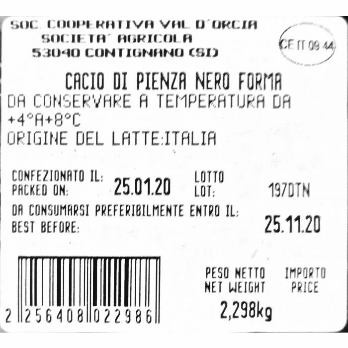 Il Cacio nero di Pienza, è un formaggio tipico senese. Viene usato esclusivamente latte di pecora. Presenta una pasta semidura, di colore bianco leggermente friabile. Il sapore di questo formaggio lo contraddistingue dai classici pecorini, infatti è più delicato asciutto ed intenso. Il processo di stagionatura del cacio di Pienza prevede almeno 40 giorni. La pesatura varia da 1,2 kg a circa 2,2 kg. La colorazione tipica nera viene utilizzata per i pecorini più stagionati