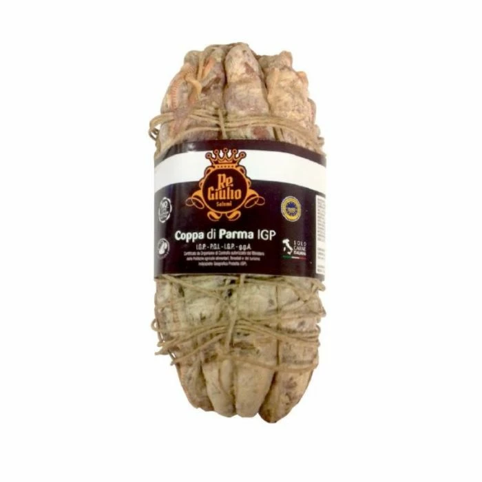 costituito da capocollo di maiale stagionato, insaccato in budello naturale e legato con della corda. La sua ricetta prevede l’utilizzo di sale, destrosio, spezie, aglio e aromi naturali, che conferiscono alla coppa un sapore intenso e aromatico. La Coppa di Parma IGP Re Giulio è un prodotto di eccellenza, ideale per chi ama i sapori autentici e la qualità dei salumi italiani.