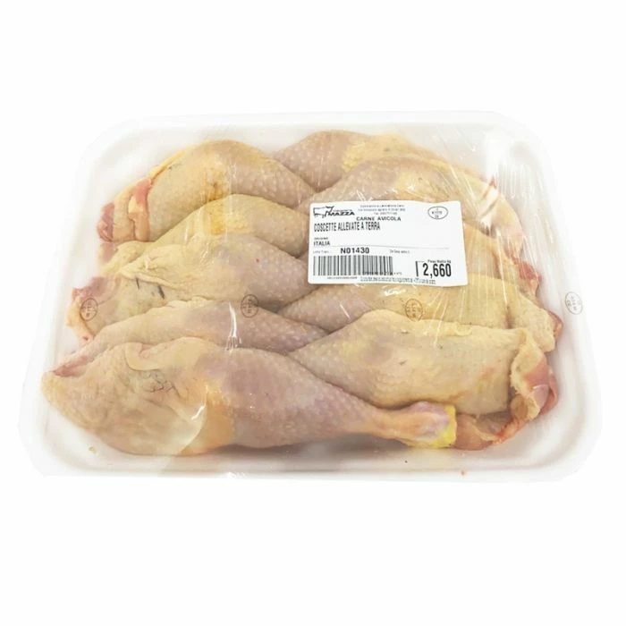 Coscette di Pollo allevato a terra 2,6 Kg sono un prodotto derivato dalla lavorazione delle carni del pollo allevato a terra, il pollo è libero di razzolare in ampi spazi aperti coperti di vegtazione dall’alba al tramonto, questo permette all’animale di sviluppare una muscolatura più consistente. L’alimentazione del pollo allevato a terra è 100% vegetale e no OGM, a base di mais, grano, orzo, altri cereali e soia.