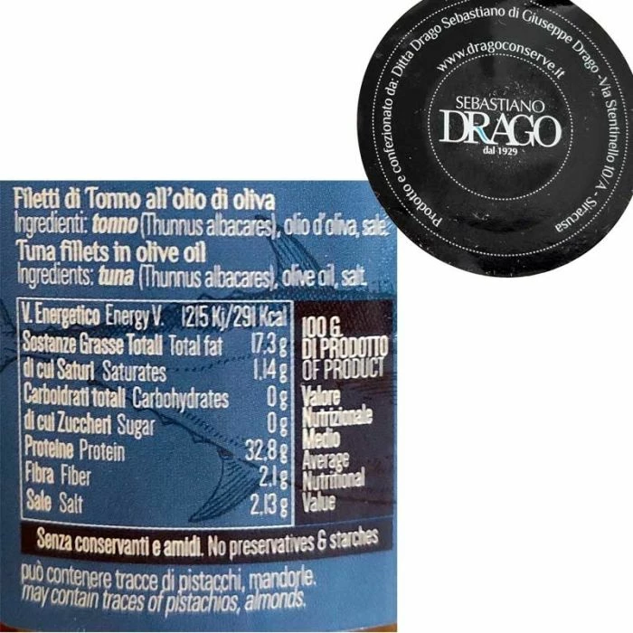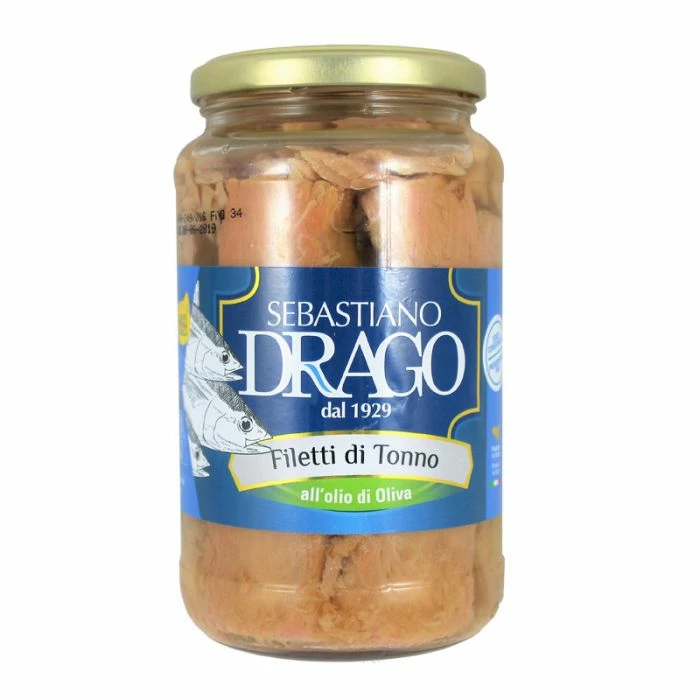 I filetti di tonno Drago in olio di oliva sono prodotti con le parti più nobili del tonno. Il tonno una volta cotto in acqua per mantenere le reali proprietà nutritive e gustative, viene tagliati in piccoli filetti i quali vengono introdotti in vasetti di vetro e colmati con olio di oliva. Il tonno Drago è un ottimo prodotto consumato in purezza, in insalate oppure utilizzato per insaporire le vostre ricette. Vendita del tonno Drago prezzi speciali per te, a casa tua in 24/48 ore.