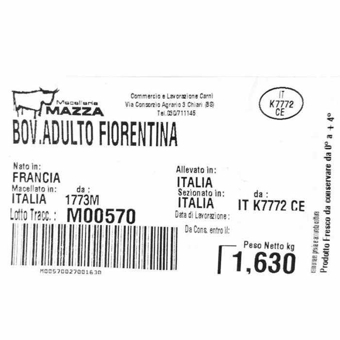 | Lavorazione | La bistecca alla fiorentina è prodotta dal lombo della scottona. Taglio che comprende osso e piccola parte del filetto. La fiorentina solitamente ha pesi maggiori della costata classica che raggiungono anche il 1 7 kg. La carne viene frollata in apposite camere nella macelleria Mazza per circa 2 settimane importantissima fase che rende la carne morbida e gustosa. La Bistecca alla fiorentina viene cotta per diversi minuti in entrambi i lati su brace o griglia meglio utilizzare legno di quercia o olivo. Mettere la carne vicino ai carboni per il primo minuto poi alzarla senza nessun condimento va girata una sola volta dopo 4/5 minuti in base alla pezzatura finire la cottura con la fiorentina in piedi dalla parte dell'osso per altri 5 minuti. |