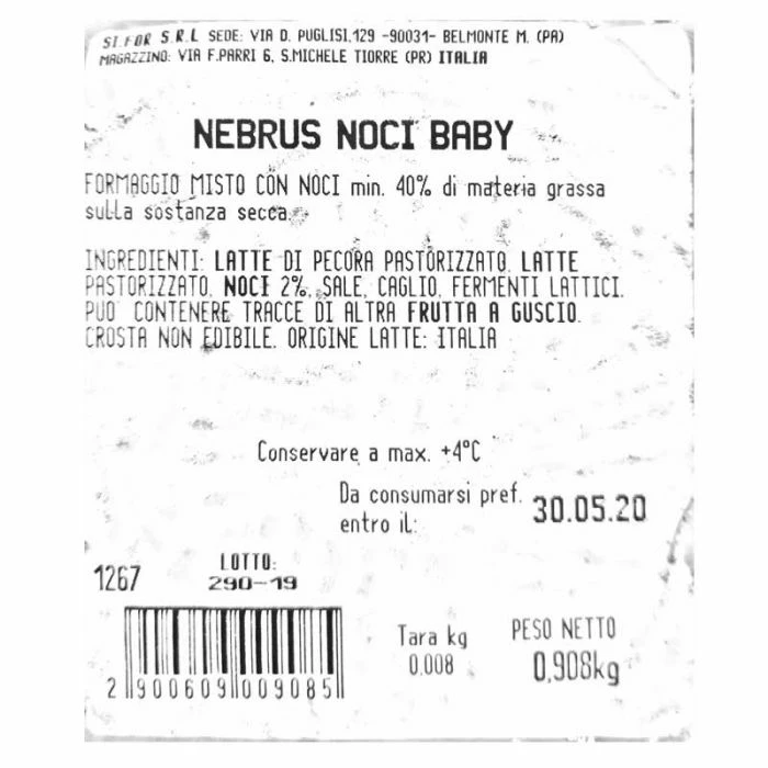 | ingredienti | LATTE DI PECORA PASTORIZZATO, NOCI 3% min. SALE, CAGLIO, FERMENTI LATTICI. PUO’ CONTENERE TRACCE DI ALTRA FRUTTA A GUSCIO. |