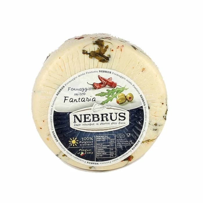 Il formaggio fresco siciliano Fantasia prodotto con latte di pecora viene aromatizzato con pezzi di rucola, olive e peproncino il quale dona al formaggio Nebrus un sapore unico e irresistibile. Il formaggio ha una breve stagionatura, la pasta si presenta di colore bianco con all’interno dei pezzi di olive verdi, peperoncino e rucola. Il formaggio fresco siciliano Fantasia è ottimo consumato come aperitivo o come basi di piatti fantasiosi.