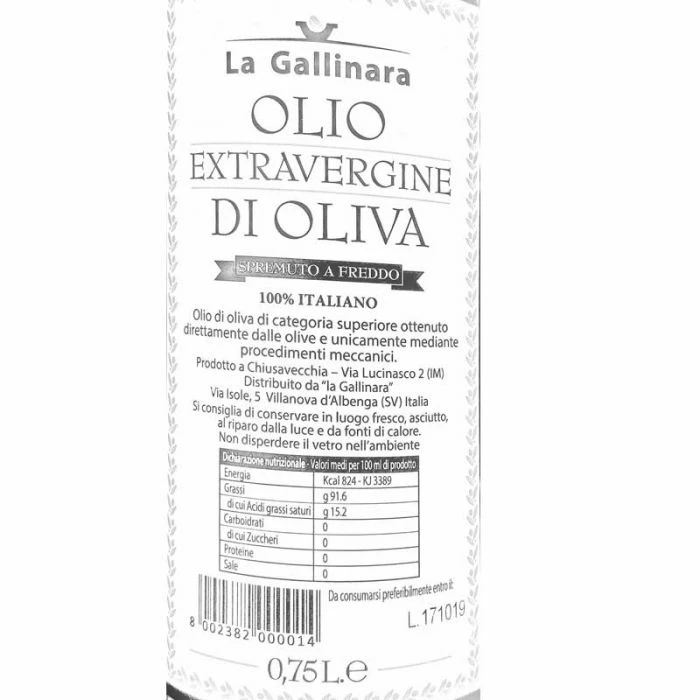 Olio Extravergine di Oliva La Gallinara. Le olive perfettamente mature vengono colte nel periodo che va da novembre. L’estrazione dell’Olio Extravergine di Oliva La Gallinara avviene a freddo. L’Olio Extravergine di Oliva La Gallinara viene filtrato prima di essere imbottigliato ed immesso sul mercato. Olio fruttato medio ottimo per insaporire i tuoi piatti.